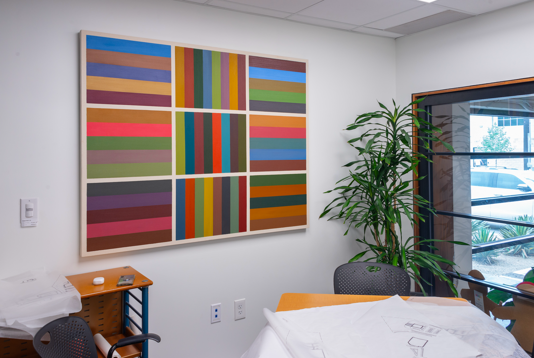With timelessness and personal application, an architectural sense is woven into Trevino’s work as he builds the canvases himself. He will arrange multiple of them in a variety of iterations, forming these patterns and unique shapes on the wall. In result, his works become more than just a painting. They extend into the realm of space, becoming an architectural creation. The colors and precise lines draw your eye in and allow you to connect with what you see to where you are, forming a fluidity of elements. It is in this space you see art and architecture interacting and speaking to each other. Trevino’s art incites just that, inviting viewers to see that art and architecture are not much different, but both a union of elements merged together with personal expression.